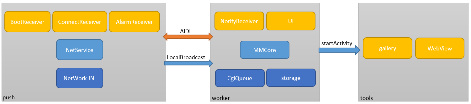 历史原因,我们在push和worker通信使用Broadcast和AIDL。实际上,我一直不喜欢这里的实现,AIDL代码冗余多, broadcast效率低。欢迎大家分享更好的思路或者方法。