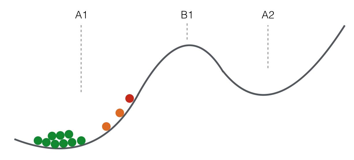 很多团队是处于 A1 状态,都期待着往耗子说的 B1 而去。我们真正要解决的问题,是如何带领团队从 A1 波谷,到达耗子描绘的 B1 波峰。除了合理分工、团队间的彼此赋能、以及土到极致的技术突破,还需要重视一个规律性: