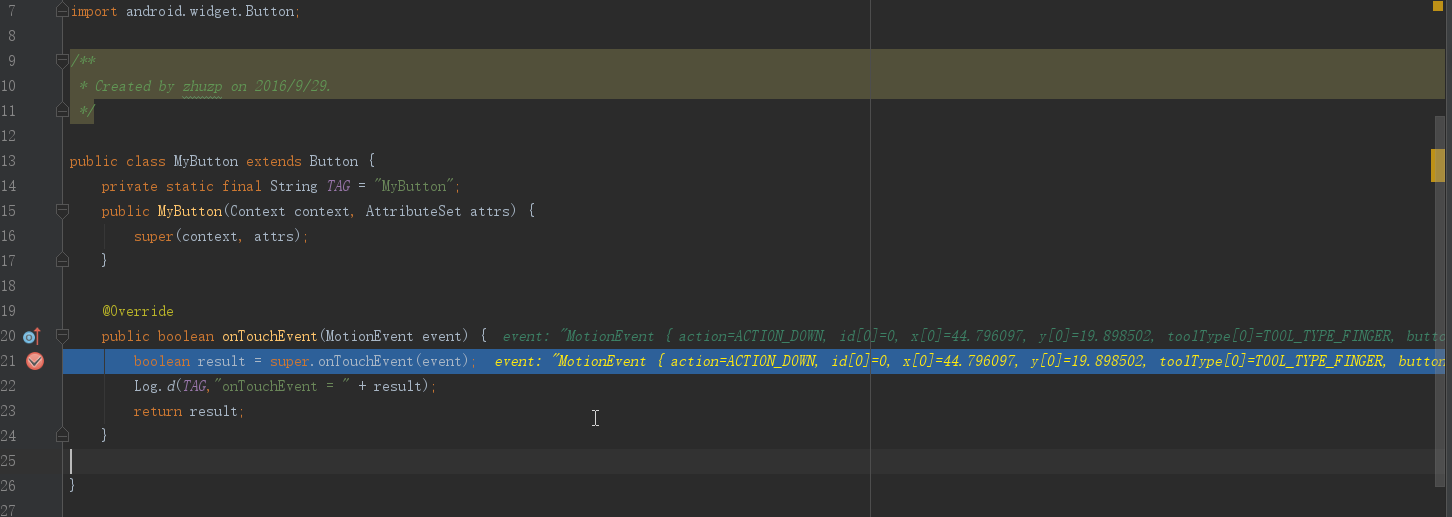 整个代码内容都很简单,为什么我们要定义一个继承Button的类,这里主要是为了通过Android Studio结合源码调试。我们在MyButton的”boolean result = super.onTouchEvent(event);”前面打个断点,然后开始debug调试。