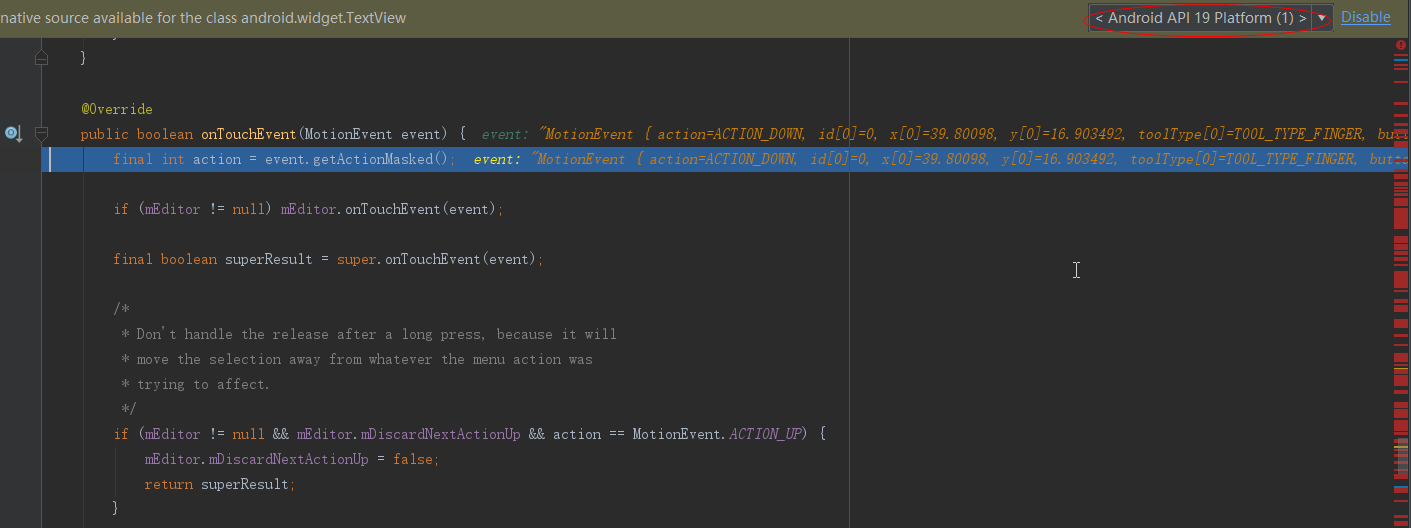如上图,然后按”F7”进入super.onTouchEvent(),如果你有安装多个sdk版本,选择你Android设备对应的版本,比如我的设备是Android4.4,那么我就选择API 19。