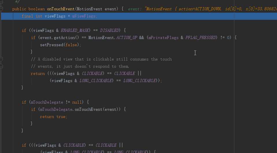 然后一直“F8”,然后走到”if (((viewFlags & CLICKABLE) == CLICKABLE ||(viewFlags & LONG_CLICKABLE) == LONG_CLICKABLE))”中,你会发现进入了这个if语句后,View的onTouchEvent()方法返回的都是true,如果没进if语句,返回的就是false。