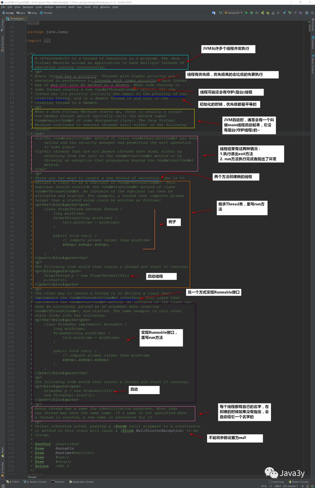 Java实现多线程是使用Thread这个类的,我们来看看Thread类的顶部注释: