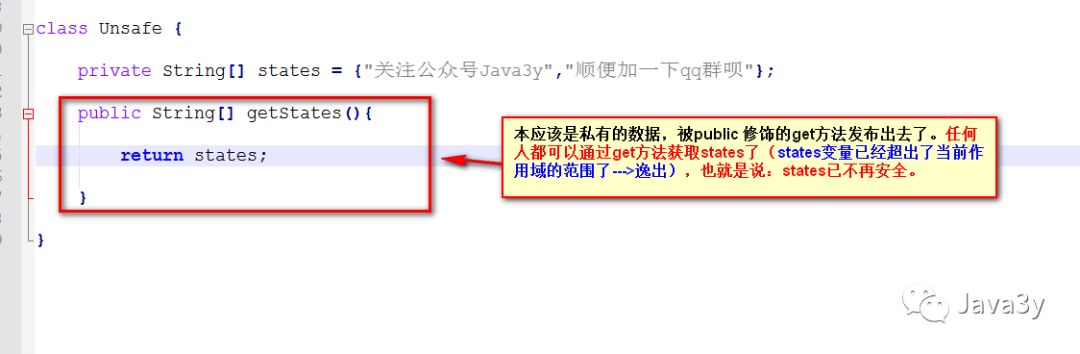 逸出就是本不应该发布对象的地方,把对象发布了。导致我们的数据泄露出去了,这就造成了一个安全隐患!理解起来是不是简单了一丢丢?