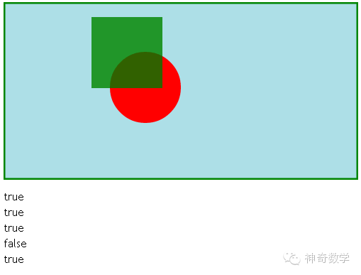 1. init(50,"mylegend",500,250,main); 2. 3. function main(){ 4. LGlobal.setDebug(true); 5. 6. var back = new LSprite(); 7. back.graphics.drawRect(5,"green",[0,0,LStage.width,LStage.height],true,"lightblue"); 8. addChild(back); 9. 10. var cObj = new LSprite(); 11. cObj.x = 200; 12. cObj.y = 120; 13. cObj.graphics.drawArc(0,"",[0,0,50,0,2*Math.PI],true,"red"); 14. back.addChild(cObj); 15. 16. var rObj = new LSprite(); 17. rObj.x = 250; 18. rObj.y = 70; 19. rObj.alpha = 0.8; 20. rObj.graphics.drawRect(0,"",[0,0,100,100],true,"green"); 21. back.addChild(rObj); 22. 23. trace(hitTestRectArc(rObj,cObj)); 24. 25. back.addEventListener(LMouseEvent.MOUSE_DOWN,function(e){ 26. rObj.x = e.offsetX-rObj.getWidth()*0.5; 27. rObj.y = e.offsetY-rObj.getHeight()*0.5; 28. trace(hitTestRectArc(rObj,cObj)); 29. }); 30. }