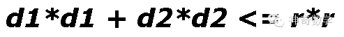 这种情况比较好解决,首先,我们计算出矩形每个角的坐标,然后用勾股定律依次算出这个角到圆心的距离是否小于或者等于半径。设这个角与圆心横坐标之差为d1,纵坐标之差为d2,半径为r,公式表达如下: