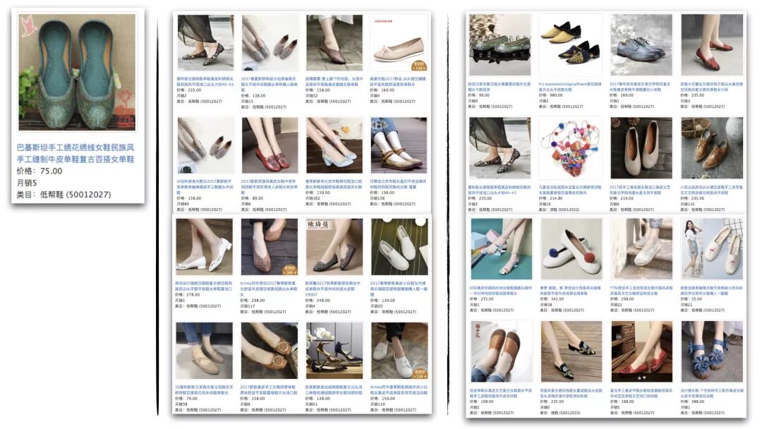 相比于经典的基于共现的i2i算法,最终版本整体在召回上更加丰富,badcase出现情况较少。全网商品在首图商品池召回的case如下,图中三列分别是原始宝贝、swing召回、graph embedding召回: