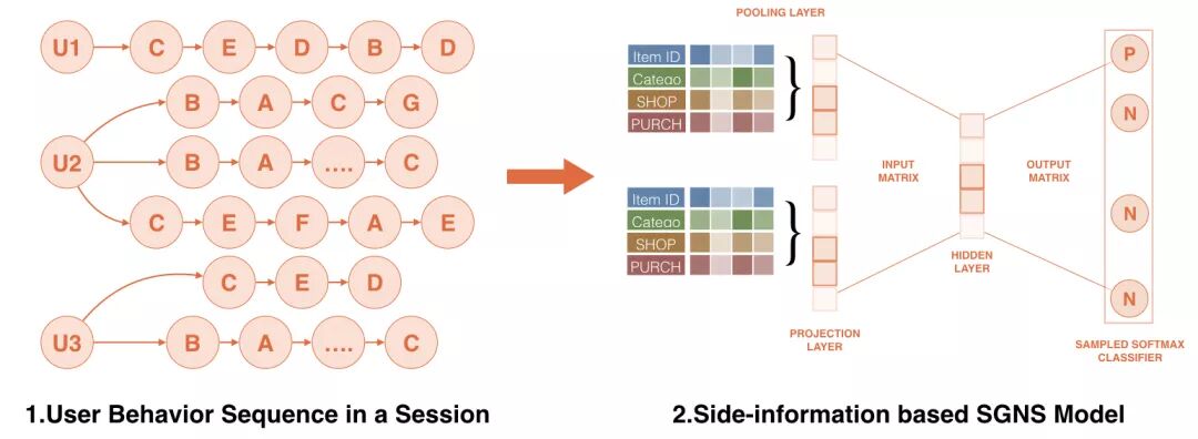 对于行为序列,短时间内的高密度点击更能够反映用户的真实意图,短期的兴趣偏好也更为集中,对比而言,基于用户点击共现的传统CF算法在数据层面会有更多的噪声。在实践中,准备行为序列数据有两个关键点值得注意:(1)如何选取行为序列的时间窗口,需要结合业务特点来进行仔细的调节;(2)如何过滤因为用户误操作而带来的噪声点,我们的实践经验是根据停留时长和类目不相似度来过滤典型的异常点击