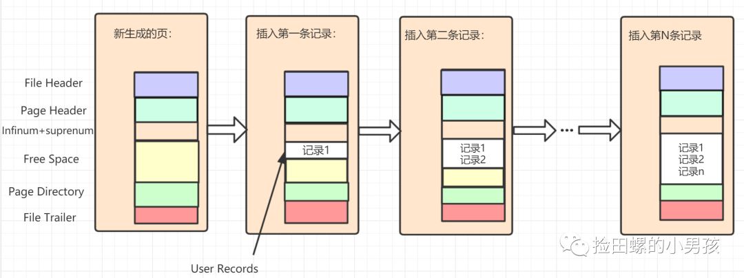 每当我们插入一条记录,都会从Free Space部分,也就是尚未使用的存储空间中申请一个记录大小的空间划分到User Records部分,当Free Space部分的空间全部被User Records部分替代掉之后,也就意味着这个页使用完了,如果还有新的记录插入的话,就需要去申请新的页了,这个过程的图示如下: