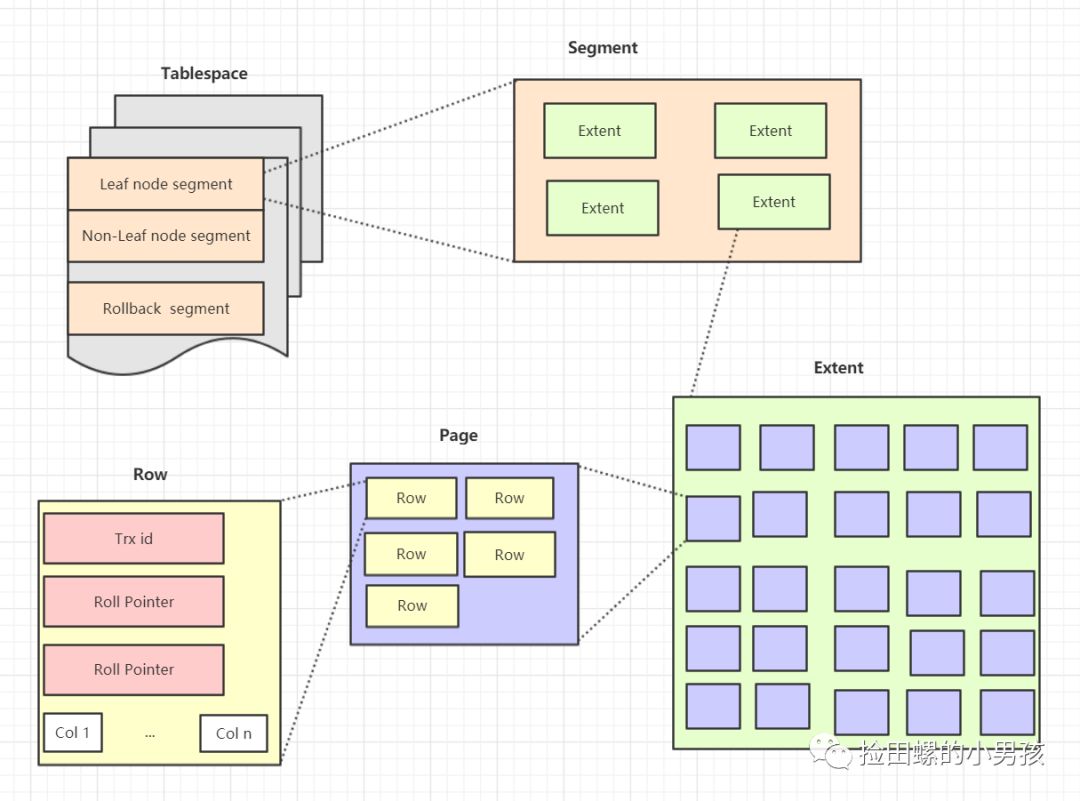 从InnoDb 存储引擎的逻辑存储结构看,所有数据都被逻辑地存放在一个空间中,称之为表空间(tablespace)。表空间又由段(segment),区(extent),页(page)组成。页在一些文档中有时候也称为块(block)。InnoDb 逻辑存储结构图如下: