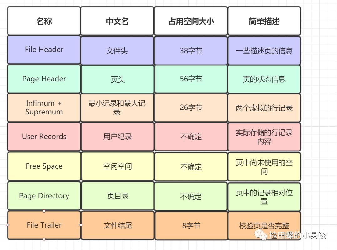 其中File Header、Page Header、File Trailer的大小是固定的,分别为38,56,8字节,这些空间用来标记该页的一些信息,如Checksum,数据页所在B+树索引的层数等。User Records、Free Space、Page Directory这些部分为实际的行记录存储空间,因此大小是动态的。