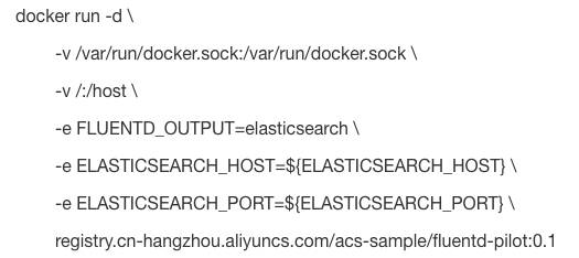我们既然要用fluentd-pilot,就得先把它启动起来。还要有一个日志系统,日志要集中收集,必然要有一个中间服务去收集和存储,所以要先把这种东西准备好,然后我们在每一个收集日志的机器上面部署一个fluentd-pilot,用这个命令来部署,其实现在它是一个标准的Docker镜像,内部支持一些后端存储,可以通过环境变量来指定日志放到哪儿去,这样的配置方式会把所有的收集到的日志全部都发送到elasticsearch里面去,当然两个管挂载是需要的,因为它连接Docker,要感知到Docker里面所有容器的变化,它要通过这种方式来访问宿主机的一些信息。