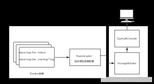 以上是fleuntd-pilot本身的一些能力,现在你可以在任何地方使用它,但是在容器服务上面我们针对它做了一些更加灵活方便、更酷的一些事情,容器服务为fluentd-pilot进行优化:
