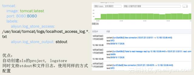 优化优点具体体现在:自动创建sls的project, logstore;同时支持stdout和文件日志,使用同样的方式配置。