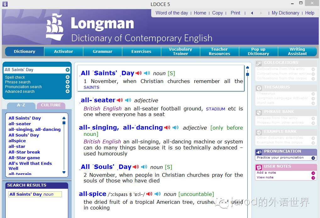 这个是LDOCE5 也就是朗文当代第5版,朗文做字典软件很用心,可以说这个字典pc软件是最好的软件。没有其它,它是best。简单说说吧,首先字典有国际音标,并且是英式美式发音都给,并且两种发音的真人发音都给。第二,提供词源,我以前很喜欢点开看词源,然后琢磨本义,引申义。