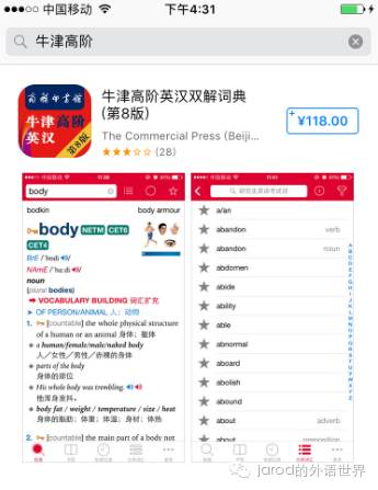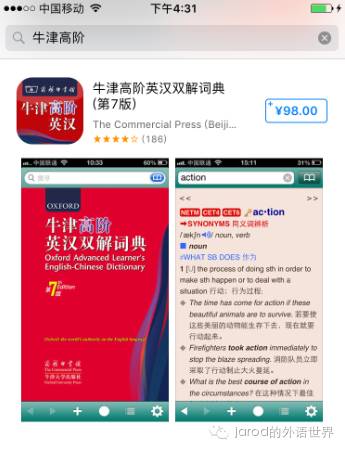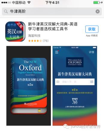 在结束之前再落实一下,我前面给的手机字典app都是英英,那么英汉有没有?那是当然,就好象有人告知我原来有道字典也和朗文当代合作出品了英汉汉英字典。这个就不在我的讨论范围,就好象金山里面也放了牛津。我们看看app store里面有什么好的英汉字典。我仅推荐一个: 就是牛津高阶英汉双解字典的app,你在app store里面输入 牛津高阶 就可以看见第八版的商务印书馆出的app: