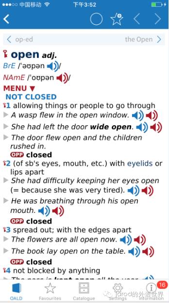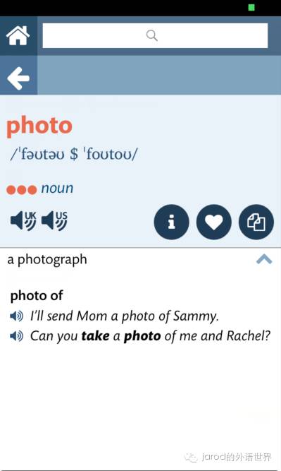 有时候分享词汇的时候无法在一张上面显示。不过OALD9 有一个很好的功能就是可以用两个手指进行快速的解释文字的放大缩小。也是方便我缩小所有解释到一张图片的。也许你不清楚这个功能,有的话就试试。也可以放大文字方便老花眼看清解释。哦对了,看见图片才发现OALD提供了例句的朗读。这一点蛮好的。不过例句的朗读好像是要联网的。所有例句朗读都放手机上似乎很大。但经过我的研判,虽然是真人发音,但朗读这么多句子也是不可能的,他们还是利用了单词单个发音,然后在服务器端进行合成然后送回手机播放。合成的发音,有点鸡肋。