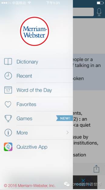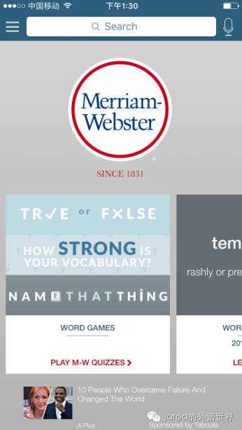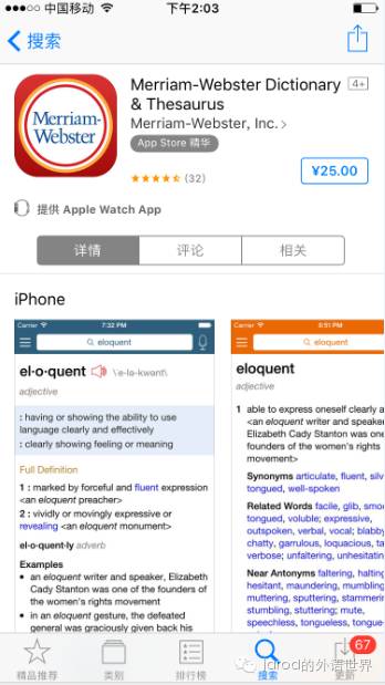 先说韦氏字典,这个字典我虽然不喜欢,但它在手机市场上走了免费版广告条路线,你可以在iphone app store市场上搜到merriam webster的软件。但分为收费版和免费版。收费的不但没有广告,还增加了同义词字典在其中。