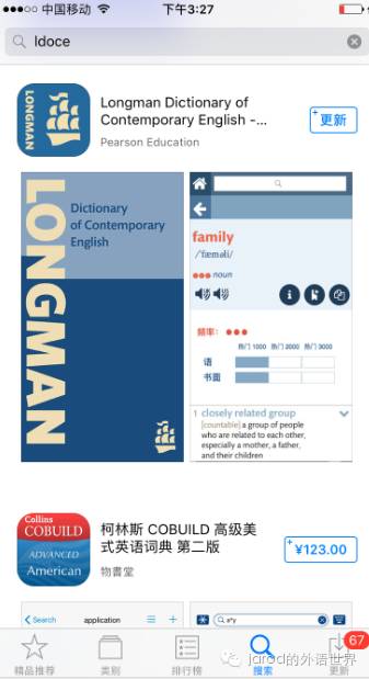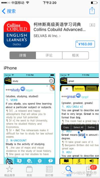 我们看其他的字典。柯林斯,在ios app store里面没有找到cobuild 高阶学习者字典,只找到了下图的字典