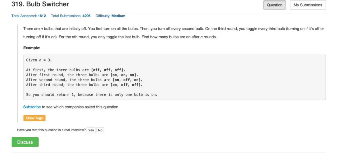 LeetCode是一个评测网站,该网站提供了近200个可以帮助用户准备技术工作面试的挑战。你可以使用该网站提供的一个而已可以使用9种编程语言的在线编辑器去直接解决这些问题。虽然你无法看见其他用户的解决方案,但是网站会给你的方案一些评估的数据,比如和其他用户相比你的代码运行速度有多快。