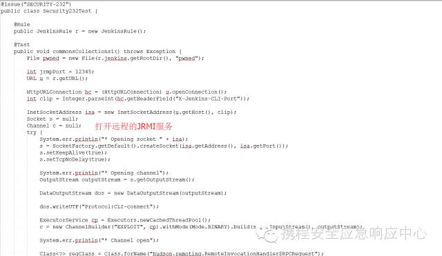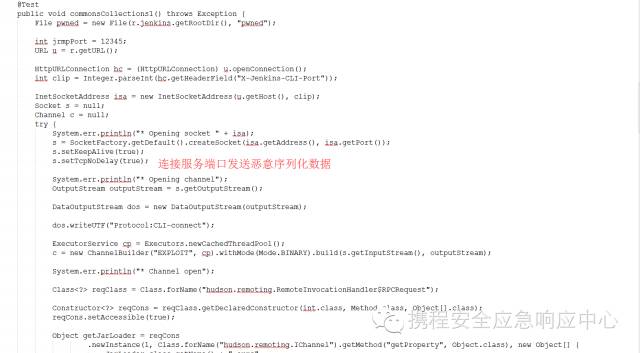 CVE-2016-0788通过Jenkins Remoting巧妙地开启JRMP,JRMP触发反序列化操作,从而进行漏洞的利用。作者已经提供了完整利用POC: