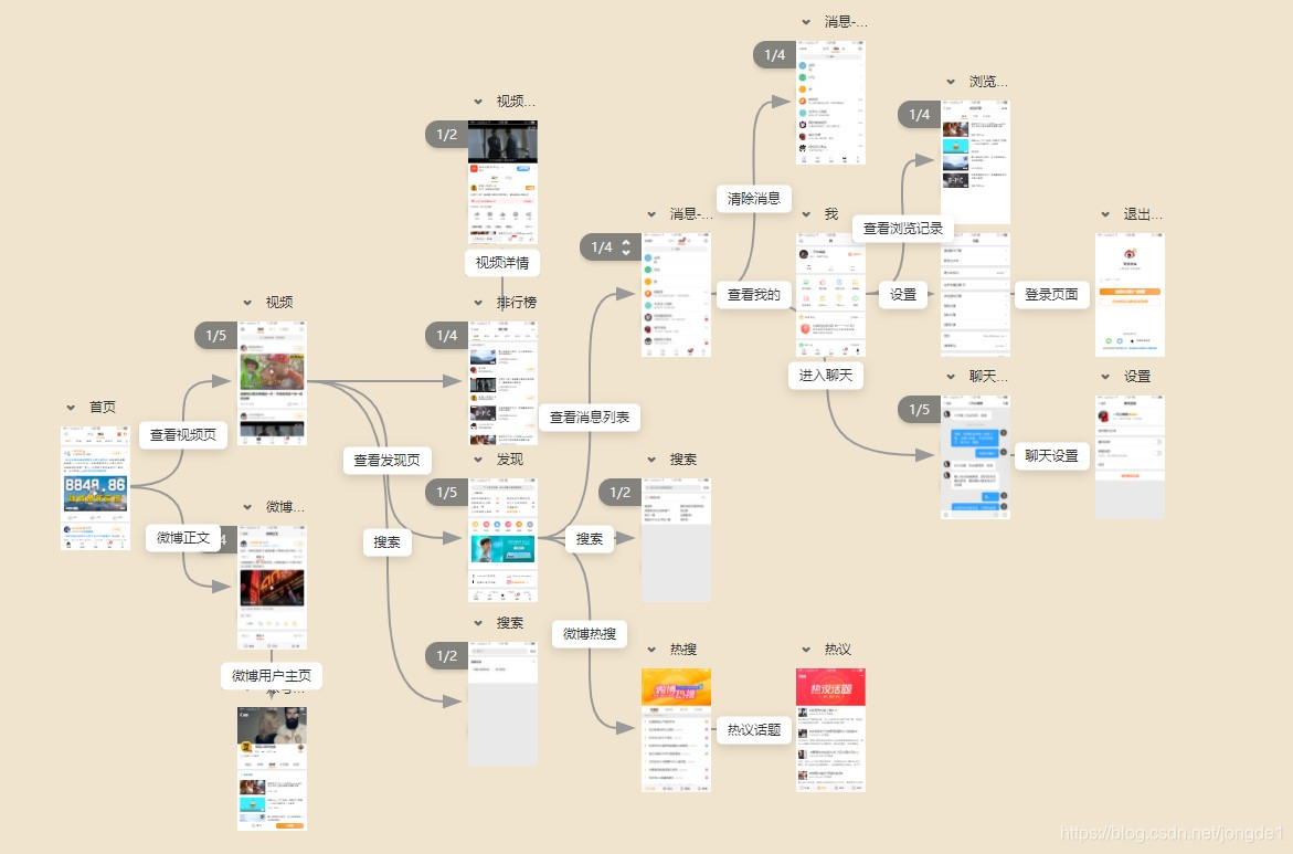 本次例子共19个页面,使用了摹客中最常用的8种交互方式以及15种交互动画,使用的组件包括面板、内容面板、选项卡等常用组件,展示基本的页面跳转。
