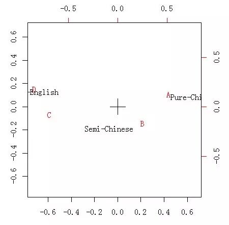 > ch=data.frame(A=c(47,22,10),B=c(31,32,11),C=c(2,21,25),D=c(1,10,20))> rownames(ch)=c("Pure-Chinese","Semi-Chinese","Pure-English")