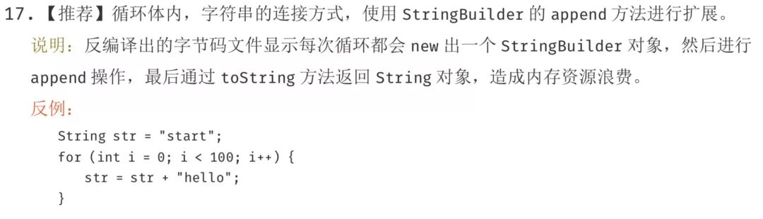 所以,阿里巴巴Java开发手册建议:循环体内,字符串的连接方式,使用 StringBuilder 的 append 方法进行扩展。而不要使用+。