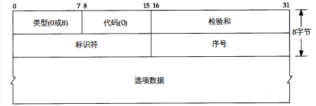 由图可知,ICMP数据包由8bit的类型字段和8bit的代码字段以及16bit的校验字段再加上选项数据组成。