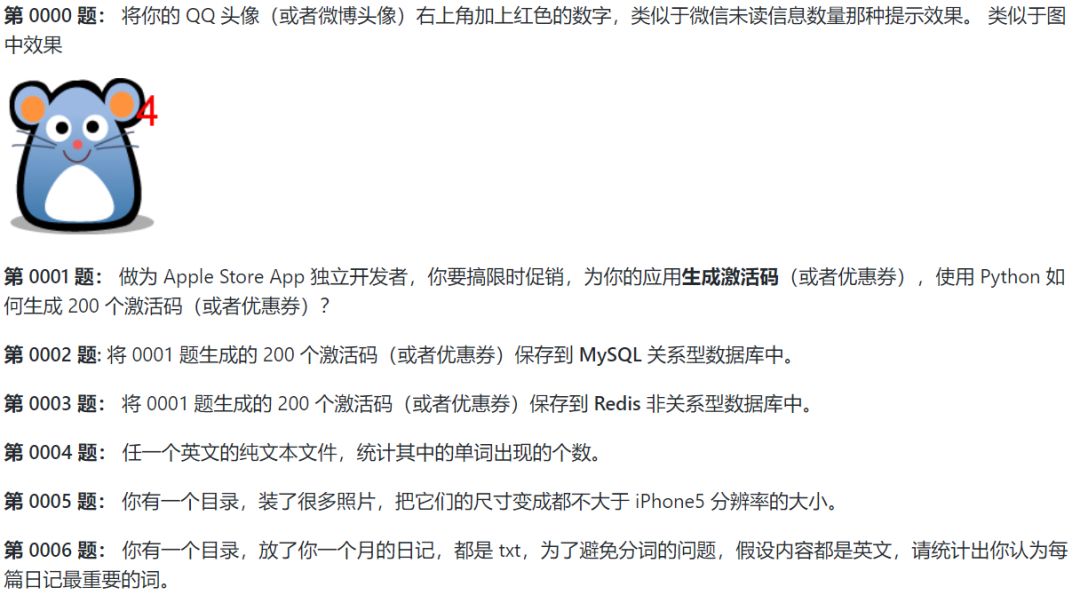 项目作者为大家准备了25道题目,让大家动手用Python来完成一些简单的需求。对于新手来说难度适中,每道题都有一定含金量。部分较难的问题作者给出了一定的思路。