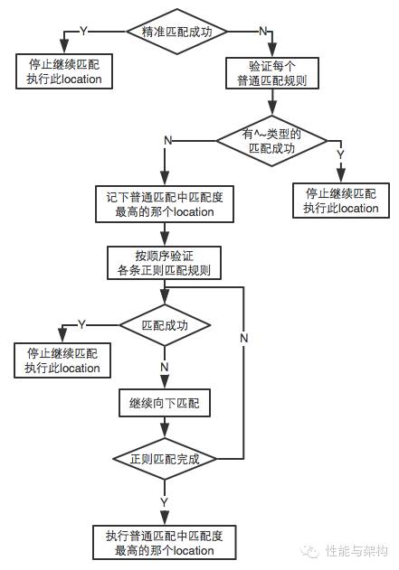 (3)按顺序验证各条正则匹配规则,有匹配的,停止继续匹配,执行此location,否则执行普通匹配规则中匹配度最高的那条