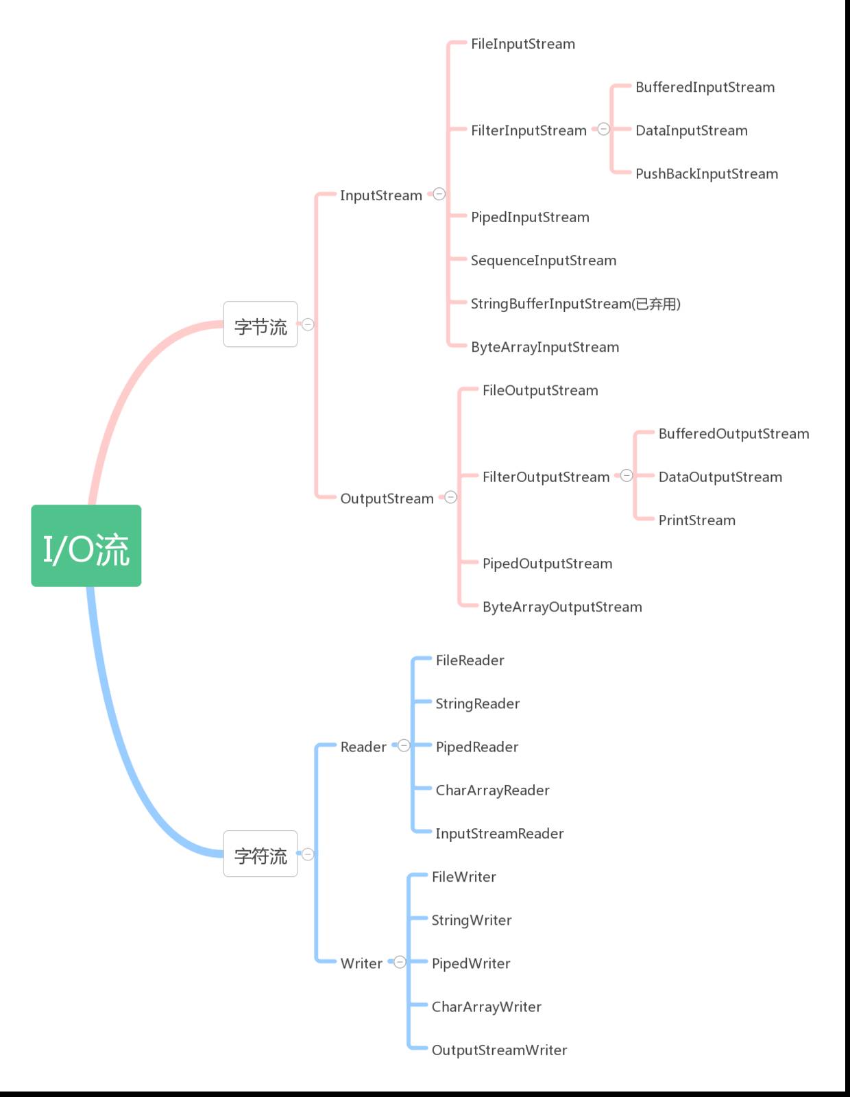 流式部分——最主要的部分。如:OutputStream、InputStream、Writer、Reader等