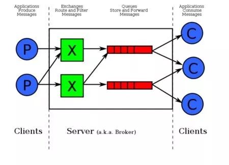 通常我们谈到队列服务, 会有三个概念: 发消息者、队列、收消息者,RabbitMQ 在这个基本概念之上, 多做了一层抽象, 在发消息者和 队列之间, 加入了交换器 (Exchange). 这样发消息者和队列就没有直接联系, 转而变成发消息者把消息给交换器, 交换器根据调度策略再把消息再给队列。
