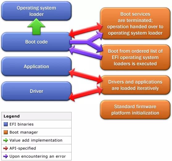 •开发效率低:大部分BIOS代码使用汇编开发,开发效率不言而喻。汇编开发的另一个缺点是使得代码与设备的耦合程度太高,代码受硬件变化的影响大。•性能差:BIOS基本输入/输出服务需要通过中断来完成,开销大,并且BIOS没有提供异步工作模式,大量的时间消耗在等待上。•功能扩展性差,升级缓慢:BIOS代码采用静态链接,增加硬件功能时,必须将16位代码放置在0x0C0000~0x0DFFFF区间,初始化时将其设置为约定的中断处理程序。而且BIOS没有提供动态加载设备驱动的方案•安全性:BIOS运行过程中对可执行代码没有安全方面的考虑。•不支持从硬盘2TB以上的地址引导:受限于BIOS硬盘的寻址方式,BIOS硬盘采用32位地址,因而引导扇区的最大逻辑块地址是232(换算成字节地址,即232×512=2TB)