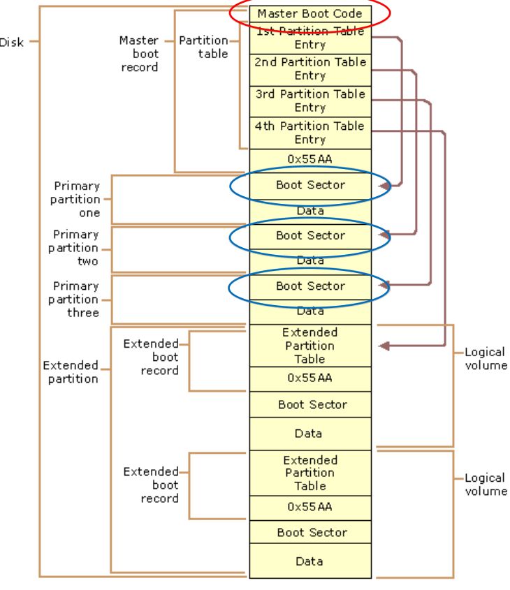 MBR-全称是Master Boot Record(主引导记录或主开机记录),是一个512byte的扇区,位于磁盘的固定位置。之所以叫“主引导记录”,是因为其存在于驱动器开始部分的一个特殊扇区,个扇区包含已安装的操作系统启动记载器和驱动器的逻辑分区信息。BIOS完成POST和初始化之后,会根据CMOS中设定的顺序选择引导的设备,这个设备可以是U盘可以是硬盘。若设置为硬盘,则BIOS就会读取MBR。MBR里面包含了一段引导程序,一个分区表和Magic Number。