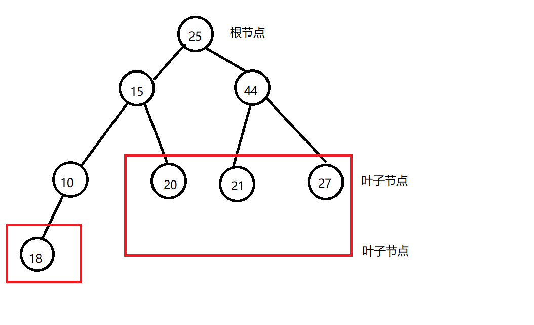 二叉树的最高层就是根节点,下面又有很多的子节点,25是15的父节点,而15又是25的子节点,其实就是一个相互的关系, 而15和44又是兄弟节点,但是有一点我们需要注意的地方就是叶子节点, 叶子节点则是红框里面的节点,就是没有子节点的我们就称它为叶子节点。