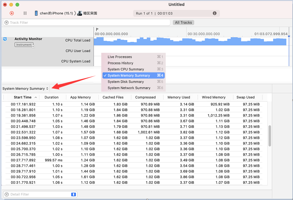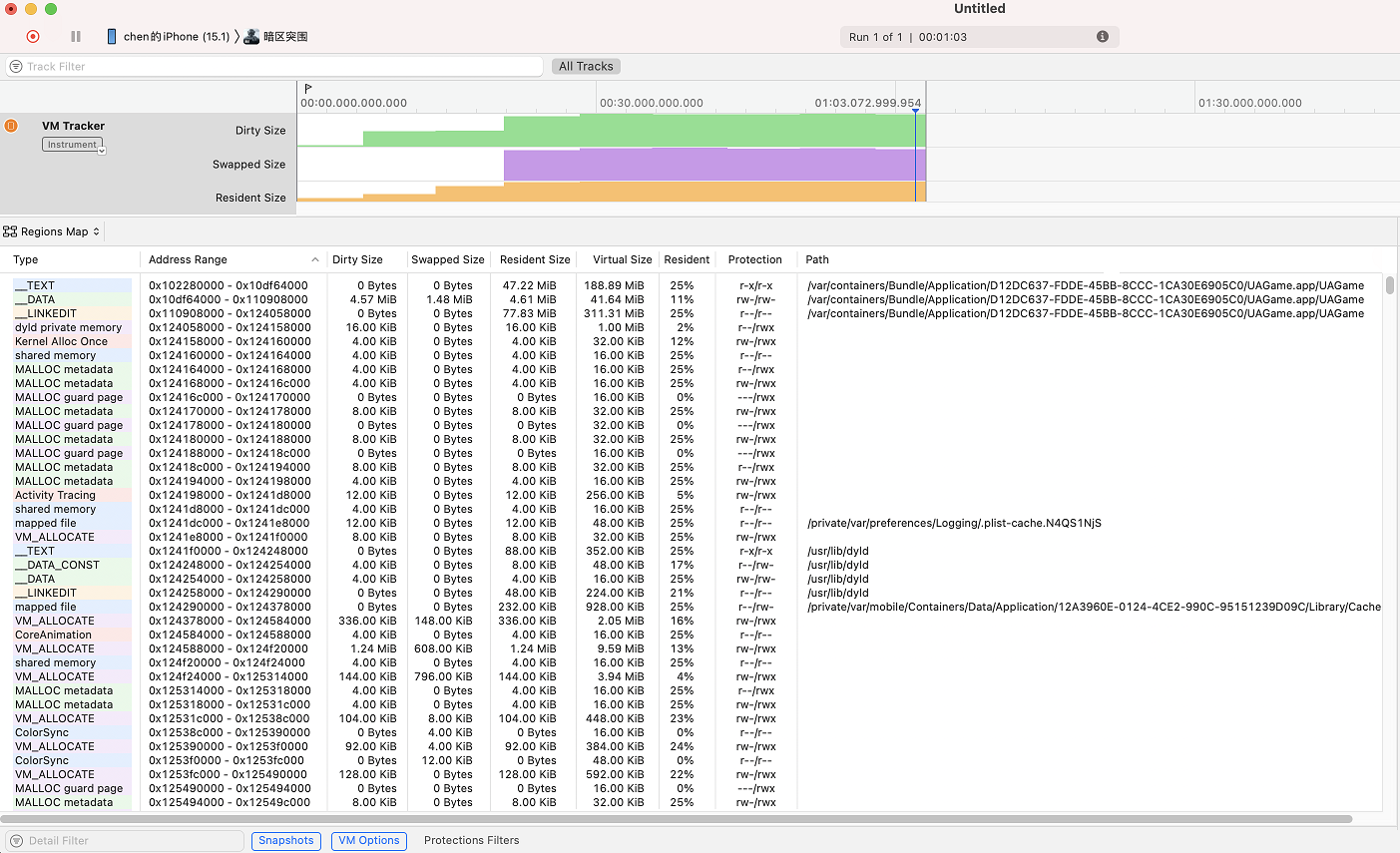 注1:*All*的Resident为App的总的内存统计。与PerfDog数值相比,少了很多内存,估计是被VM Tracker剔除掉了。