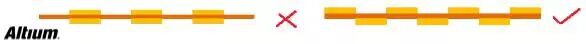 在挠性区(Flex)若有不同层上的走线,尽量避免一根线在顶层,另一根线在底层它的相同路径。这样在软板弯折的时候,上下两层的走线铜皮的受力不一致,容易造成线路的机械损坏。而应该错落开来,将路径交叉排列。如下图所示。