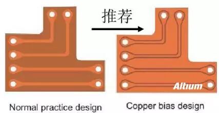 焊盘和过孔在符合电气要求的情况下,赢取最大值,焊盘与导体之间连接处采用圆滑的过渡线,避免直角。独立的焊盘应加盘趾,以加强支撑作用。