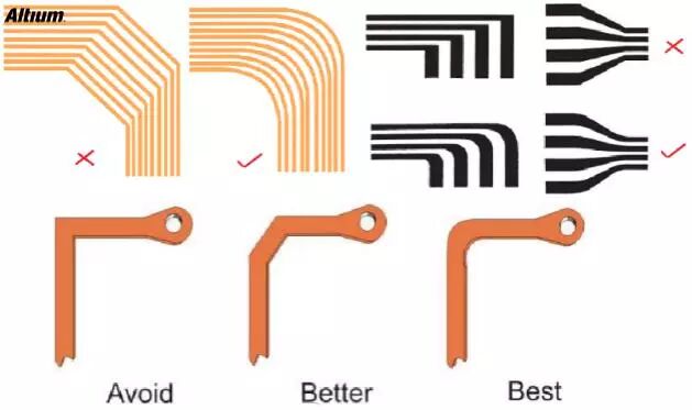 在挠性区(Flex)的走线设计要求最好走圆弧线,而非角度线。与硬板(Rigid)区的建议相反。这样可以保护柔性板部分线路在弯折时不易折损。线路也要避免突然的扩大或缩小,粗细线之间采用泪滴形弧线连接。