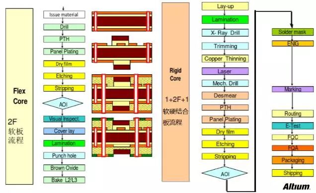 大家都知道软硬结合板是FPC与PCB的组合,软硬结合板的生产应同时具备FPC生产设备与PCB加工设备。首先,由电子工程师根据需求画出软性结合板的线路与外形,然后,下发到可以生产软硬结合板的工厂,经过CAM工程师对相关文件进行处理、规划,然后安排FPC产线生产所需FPC、PCB产线生产PCB,这两款软板与硬板出来后,按照电子工程师的规划要求,将FPC与PCB经过压合机无缝压合,再经过一系列细节环节,最终制程软硬结合板。