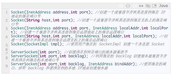 构造方法的参数中,address、host和port分别是双向连接中另一方的IP地址、主机名和端 口号,stream指明socket是流socket还是数据报socket,localPort表示本地主机的端口号,localAddr和bindAddr是本地机器的地址(ServerSocket的主机地址),impl是socket的父类,既可以用来创建serverSocket又可以用来创建Socket。count则表示服务端所能支持的最大连接数。