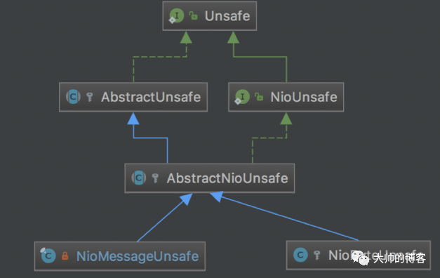 还有一个Unsafe,前面说过每个Netty的Channel都有一个Unsafe接口与之绑定,Unsafe接口的相关实现类负责实现Netty的Channel所有I/O操作,一共有两类unsafe的实现类,即服务端Channel的NioMessageUnsafe,它的主要作用就是读新连接,还有客户端Channel的NioByteUnsafe,它的主要作用是读、写已有连接上的数据,复习下两者的继承关系: