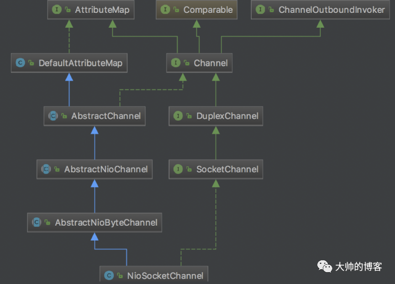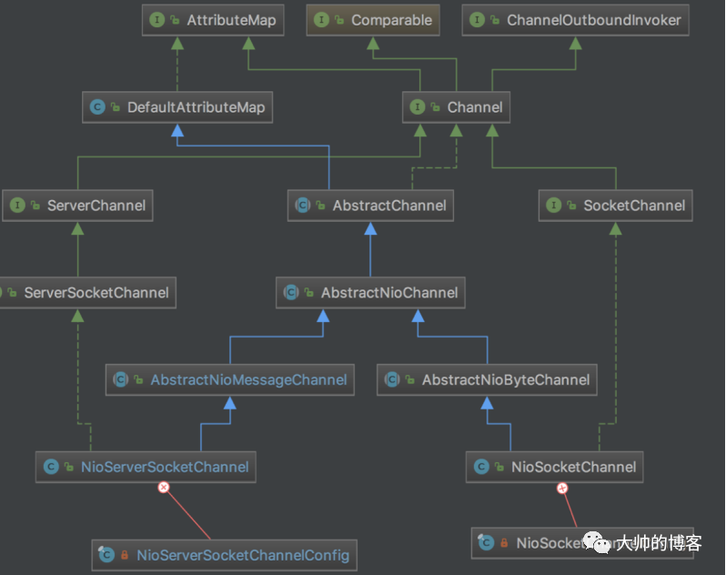 一个精简版的类图如下,蓝色部分是服务端Channel,白色是客户端的Channel。