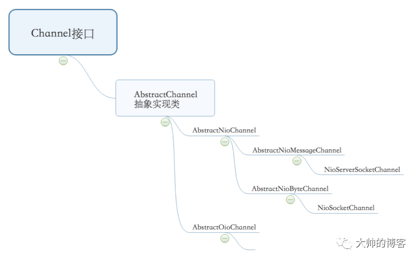 我们只关心对JDK NIO的封装设计,从顶到下,基本脉络是:Channel接口>AbstractChannel(所有Channel的骨架实现)>AbstractNioChannel(NIO模型下Channel的骨架),而从AbstractNioChannel又开始分支,如下: