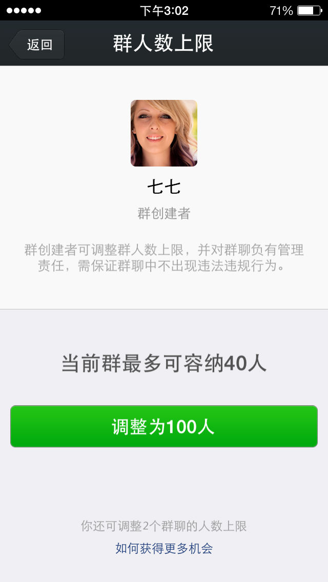 5.1版上线后在群权限上出现过BUG,出现过千人群,老贼我也不幸被拉进去过,一个晚上收到2000多条消息…被微信修正后现在的群人数上限将只能由群主来提高,其他人即便有高权限在超过基础群人数后也无法往群里拉人。