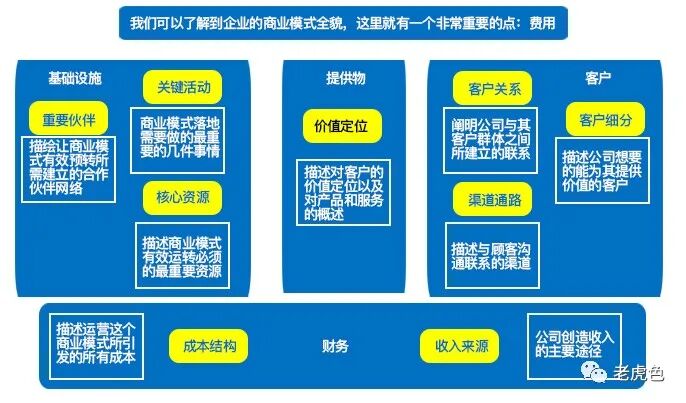 通过商业模式画布,我们可以了解到企业的商业模式全貌,这里就有一个非常重要的点:费用。如下图所示,我们在多个节点中看到都有谈到费用的地方,说明费用在商业模式中是非常重要的一点,且费用是一个公司长久的存活的保障。