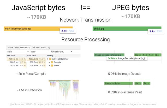 和脚本相比, 浏览器也会花费很多时间来处理同等大小的图片(图片仍需要被解码). 但是在大多数移动设备上, JS 更有可能对页面的交互性产生负面影响.