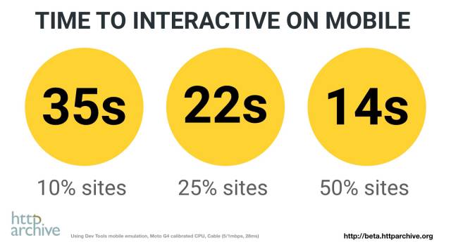 通过 HTTP Archive 分析约前 500K 网站在移动设备上传输的脚本大小, 可以发现 50% 的网站需要占据 14s, 用户才可以与网站交互, 但是这些网站仅用 4s 时间来解析和编译 JS.
