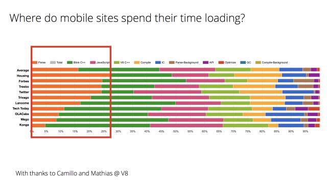 通过 V8’s Runtime Call Stats, 我们可以分析一些受欢迎移动站以及 PWA 应用的加载时间. 从下图可以看出, 脚本解析所需要的时间(橙色部分)是页面加载中最耗时的一部分: