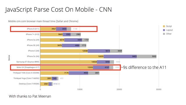 与普通手机(Moto G4) 需要花费约 13s 来解析/编译 CNN 网站的 JS 相比, 高配 iPhone 8 仅需要约 4s 时间.这可以显著地影响用户与该站点完全交互的速度.